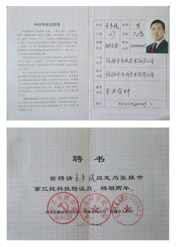 2011榮獲張掖市科技特派員證書